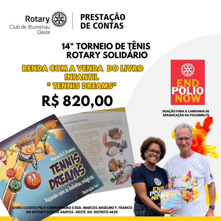 O Rotary Club de Blumenau Oeste, recebeu a doações de do livro “Tennis Dreams” do rotariano e escritor Marcos Anselmo F. Franco do Rotary Club de Santos- Oeste do distrito 4420. O livro traz de forma lúdica e de fácil leitura para as crianças, as regras do jogo de Tênis e também faz a criança viajar nas histórias das grandes competições que acontecem ao redor do mundo.
