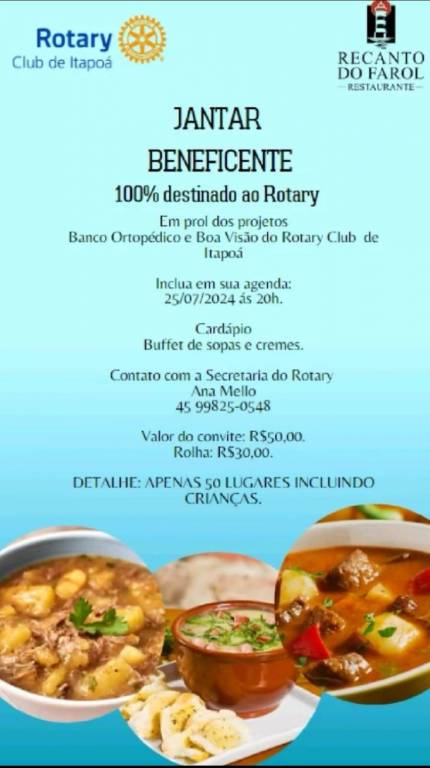 Aconteceu no dia 25/07 o 5°Jantar do ano no Restaurante "Recanto do Farol" esses jantares 100% das vendas é destinado ao Rotary Club de Itapoá no qual investe essa verba em dois projetos o Banco Ortopédico e o Boa Visão.